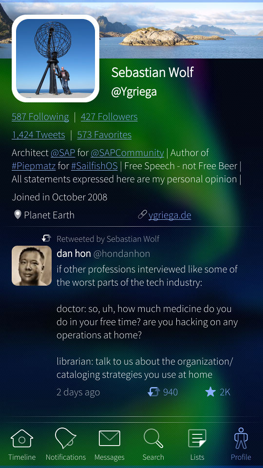 Piepmatz supports all the features of Twitter that you need to say up-to-date. Your personal timeline, notifications, media etc. - coming with a lot of eye-candy!